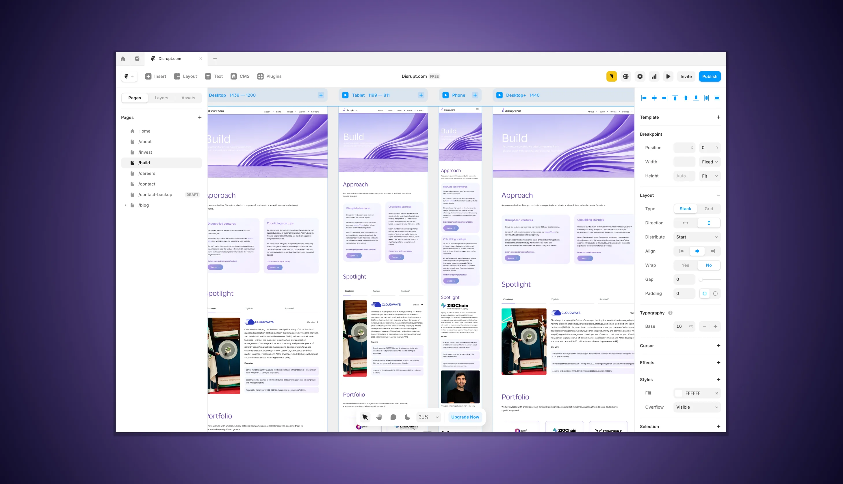 We began by developing a robust, user-centered architecture—mapping key journeys for founders, partners, and visitors. This involved designing flexible content blocks and navigational structures that could adapt as the identity matured. Each section of the site was created with a strategic purpose—from defining Disrupt.com’s venture approach to showcasing its portfolio of companies.